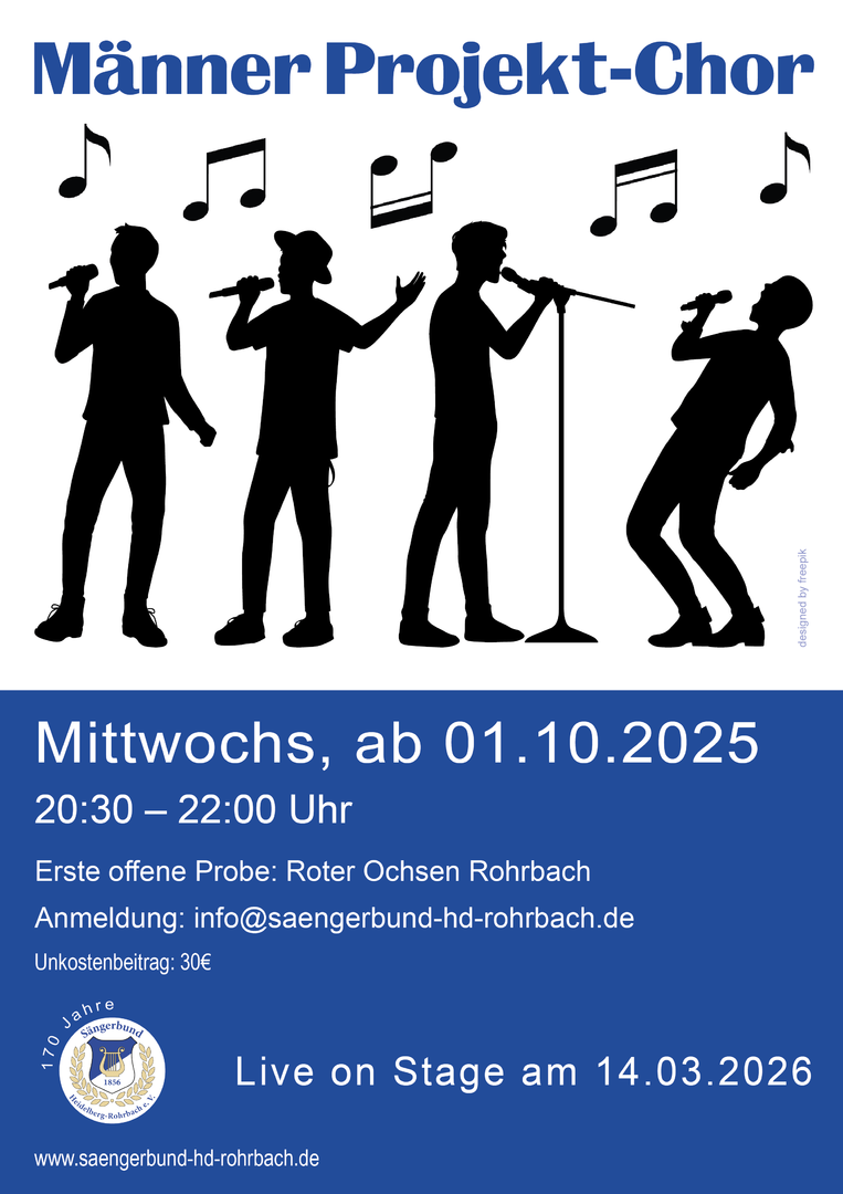 Wir suchen Sänger (TTBB) für einen Projektchor, der bei unserem Jubiläumskonzert am 14. März 2026 im Kulturhaus Rohrbach auftreten soll.