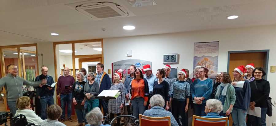 Jedes Jahr im Dezember trifft sich unser gemischter Chor "Modern United" im Pflegewohnheim Agaplesion Bethanien Lindenhof zu einem Weihnachtssingen auf einer Station. Leider musste es letztes Jahr wegen Corona ausfallen und dieses Jahr haben wir uns in der eigenen Kappele des Hauses getroffen und unsere Weihnachtslieder wurden über die Tonanlage zu jedem Bewohner übertragen.